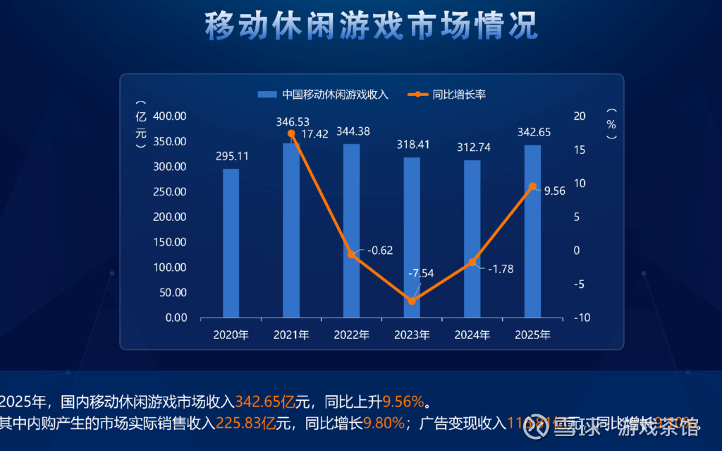 2025年,国内移动休闲游戏市场收入342.65亿元,同比上升9.56%。其中内购产生的市场实销收入225.83亿元,同比增长9.8%;广告变现收入116.81亿元,同比增长9.1%。