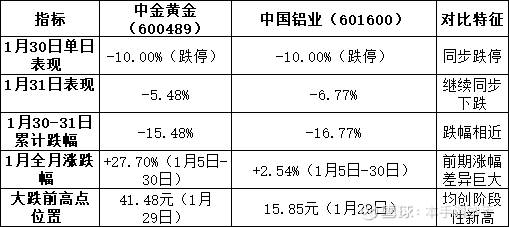 • 1月31日:继续同步下跌(中金黄金-5.48%,中国铝业-6.77%),方向一致