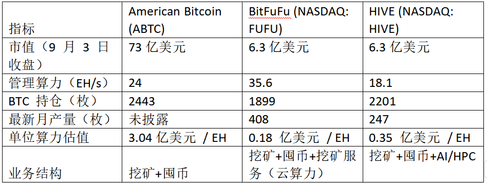 热闹归热闹,二级市场最终要回到估值与成长性。我们横向了对比了American Bitcoin和另两家比特币矿企BitFuFu和HIVE,拉了一张简明对照表:
