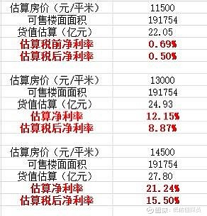 为了计算利润,那么就要估算下货值了。这里我按照平均11500,13000,14500每平米三种单价去进行估算。理由是同区的中海天空之镜目前售价13000。