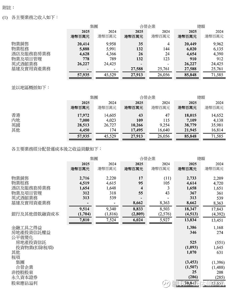 长实集团2025年这个收入和收益还算平稳,物业销售这块增收不增利,物业销售收益/收入=13.2%,去年是22%,这也符合地产的宏观状况。今年108亿股东应占溢利,其中物业租务大约是46亿收益,比去年少一个亿,下行周期租金还是比较稳定的。对应现在1500亿市值,还是可以继续拿着。