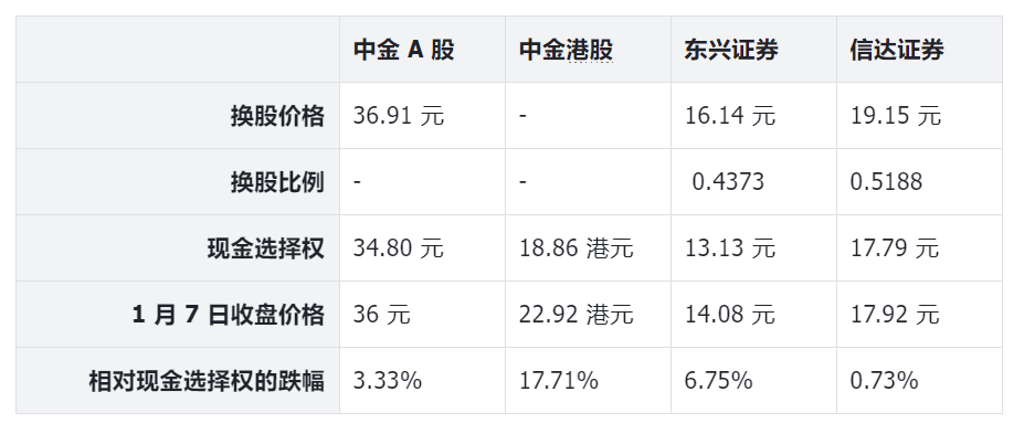 - 1 股东兴证券换 0.4373 股中金 A 股