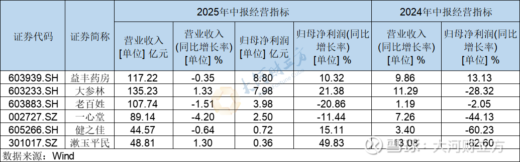 大河财立方记者发现,2025年上半年,6家A股上市连锁药店中,有4家营收出现不同程度下滑;营收同比增长的两家,增速均不超过1.4%。而2024年上半年,6家上市连锁药店营收均实现增长。