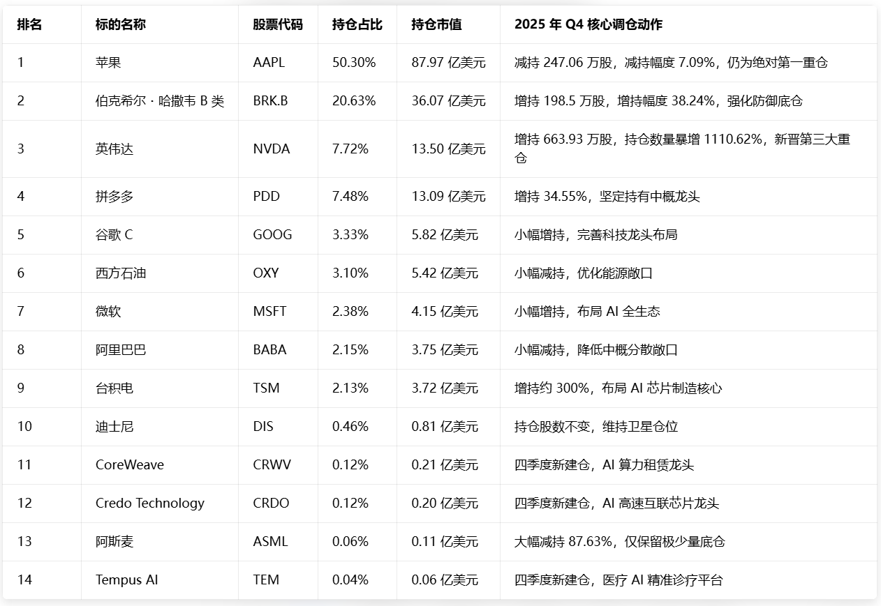 注:13F 报告仅披露美股正股持仓,不覆盖段永平擅长的期权操作、港股 / A 股持仓(如腾讯控股、贵州茅台等),其港股核心持仓仍以腾讯控股为主,长期持有无减持动作。