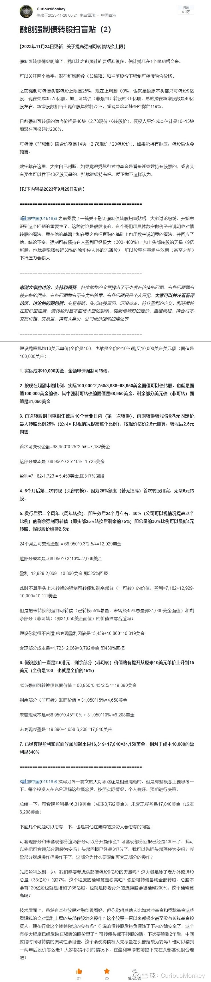 1. 强制可转债持有人平均持仓成本在10~15块(100块面值),相当于通过转股以0.6至0.9港元每股购入股票(10% x 6港元转股价;15% x 6港元转股价)。当前股价隐含回报颇为丰厚还有100~200%。
