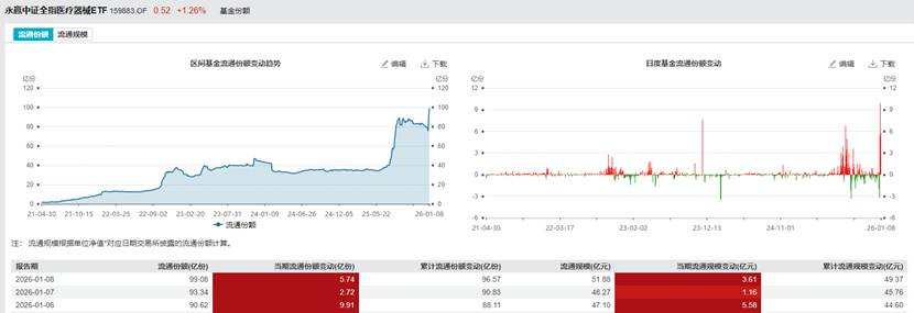 脑机概念的市场关注度持续升温,全市场规模最大且脑机接口含量最高的医疗器械ETF(159883)今日延续强势表现,高开后震荡上行,盘中最高涨幅突破1%,日K线实现二连阳。资金追捧热度不减,盘中净申购金额超2亿元,连续四个交易日累计净流入超10亿元,充分彰显了市场对该赛道的坚定信心。目前,该ETF流通份额已达99.08亿份,逼近百亿大关,流通规模攀升至51.88亿元,创下历史新高。