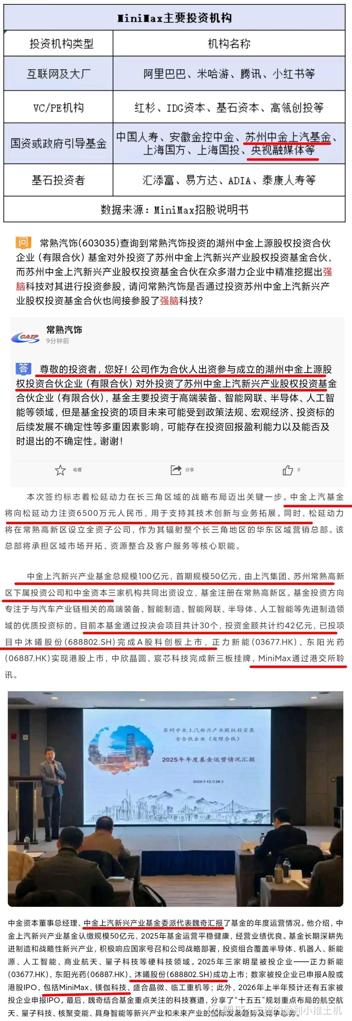 苏州中金上汽和央视融媒体都投资了MiniMax ,MiniMax实现全模态技术布局,跻身全球第一梯队,这家中国公司仅用了OpenAI约1%的成本,就走完了相似的技术路径。仅用了OpenAI约1%的成本只有5%的性能差距,央视融媒体投资了MiniMax参股央视融媒体的影子公司全部涨停,参股央视融媒体的有东方明珠 南方传媒 国脉文化 浙数文化 当虹科技,而同样通过苏州中金上汽参股了MiniMax的影子股常熟汽饰还在低位