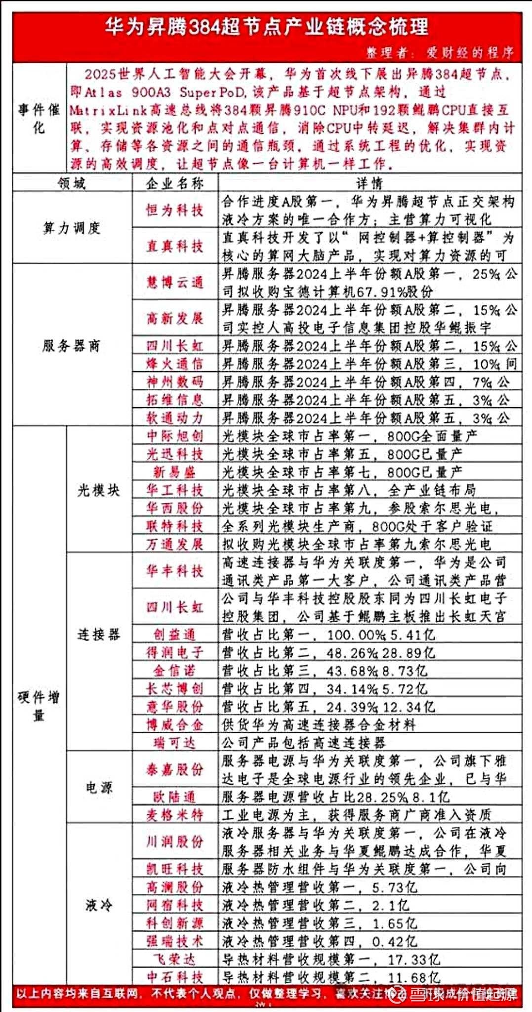 2025世界人工智能大会上,华为Atlas 900A3 SuperPoD的亮相,正式宣告国产算力进入“超节点时代”。这张图把昇腾384超节点的产业链脉络梳理得明明白白,从算力调度、服务器、光模块,到连接器、电源、液冷,每一个环节都藏着明确的投资主线。
