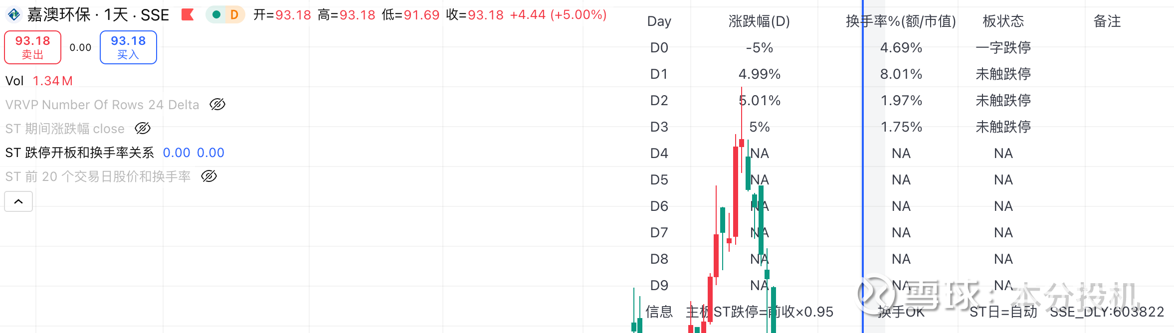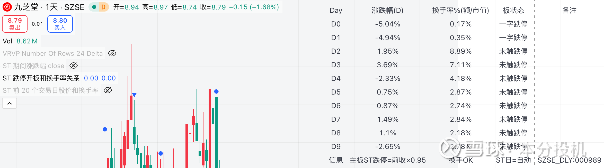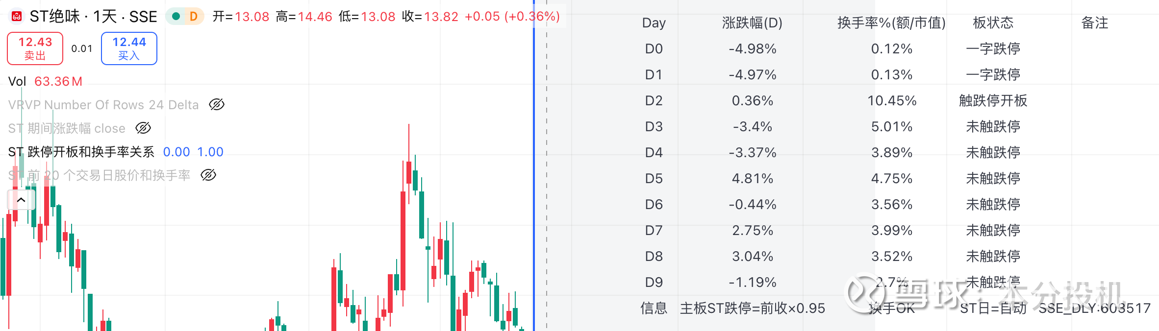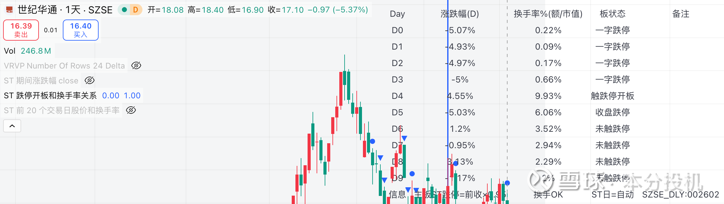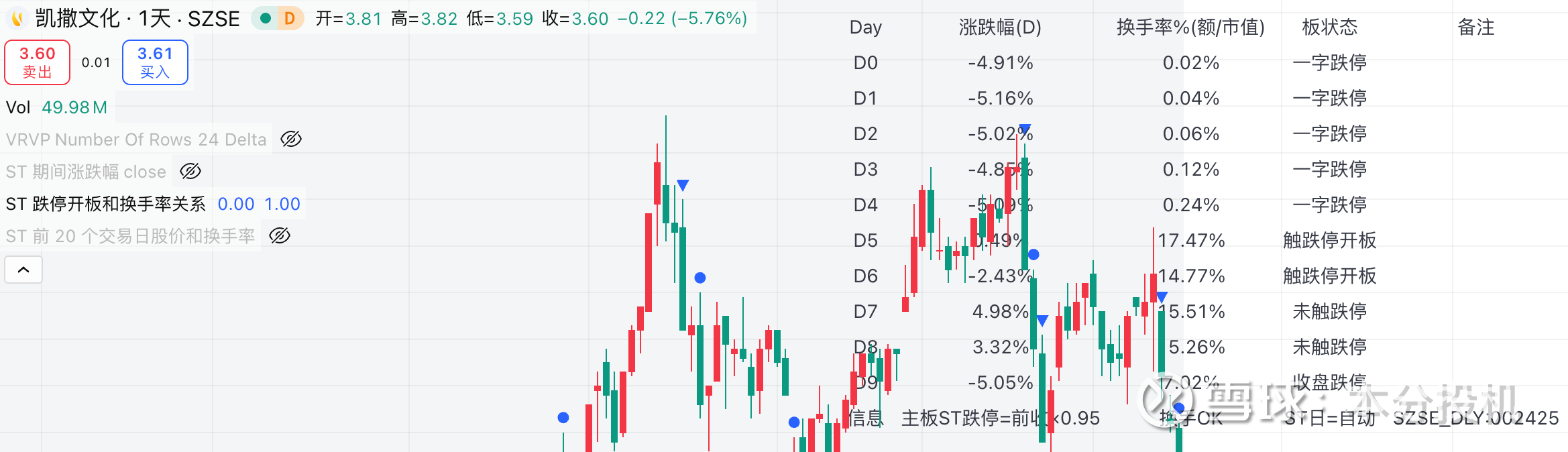 全天封死跌停毫无意外,但是开盘成交 20 万手、3 亿成交额,全天 1.48% 的换手率就太出人意料了,这基本上是 ST 股开板前一天的换手率水平。