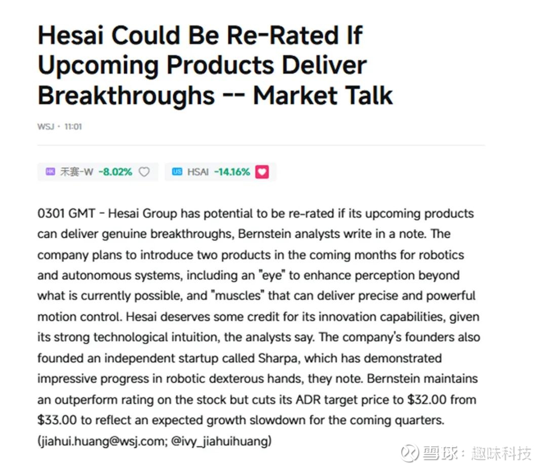 有人拿大行评级说事。伯恩斯坦今天把禾赛目标价从33美元调到32美元,H股从253港元调到249港元,但维持“跑赢大盘”评级。