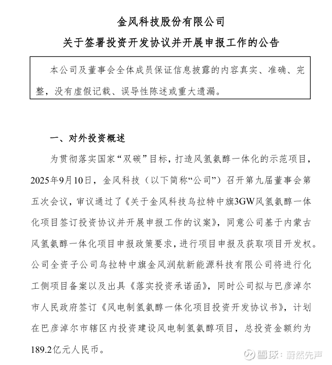9月11日,金风科技公告投资189.2亿元建设内蒙古巴彦淖尔风电制氢氨醇项目。这笔投资超过公司2024年全年净利润10倍,也是该公司历史上单项投资规模最大的项目。