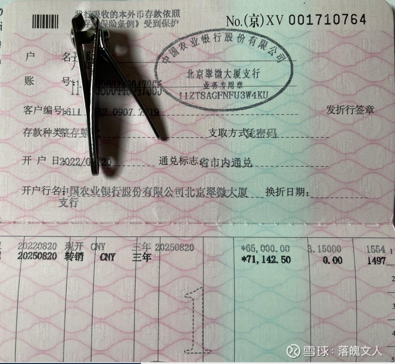 今天(2025.8.20),父亲三年前存的农行定期存款到期,本金65000元,利率3.15%,利息合计6142.50元。