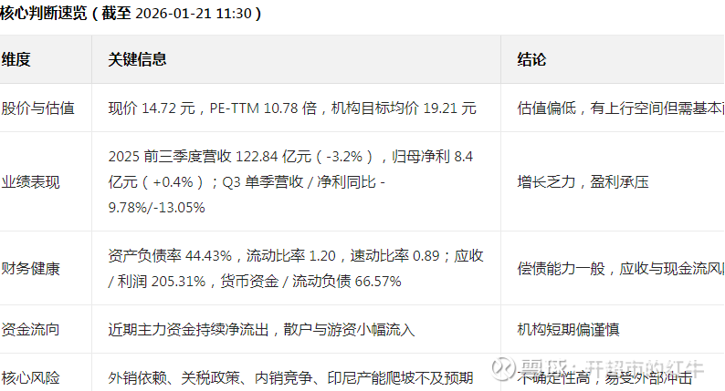 风险与不确定性 外销占比高,美国关税政策变化、海外需求波动直接影响订单与利润;内销价格战加剧,自主品牌盈利难度上升。 印尼产能建设与爬坡进度、原材料成本波动、汇率风险等,均可能拖累业绩,增加重仓风险。