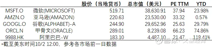 在美股投资者可以参与甲骨文、Nebius、Coreweave(新云),或者微软、亚马逊(老云),或者鉴于两者之间的谷歌,都是非常不错的公司。特别是甲骨文未来非常夸张的增速、谷歌在云的基础上做的AI等等,当然也看到微软和亚马逊在不断反击。