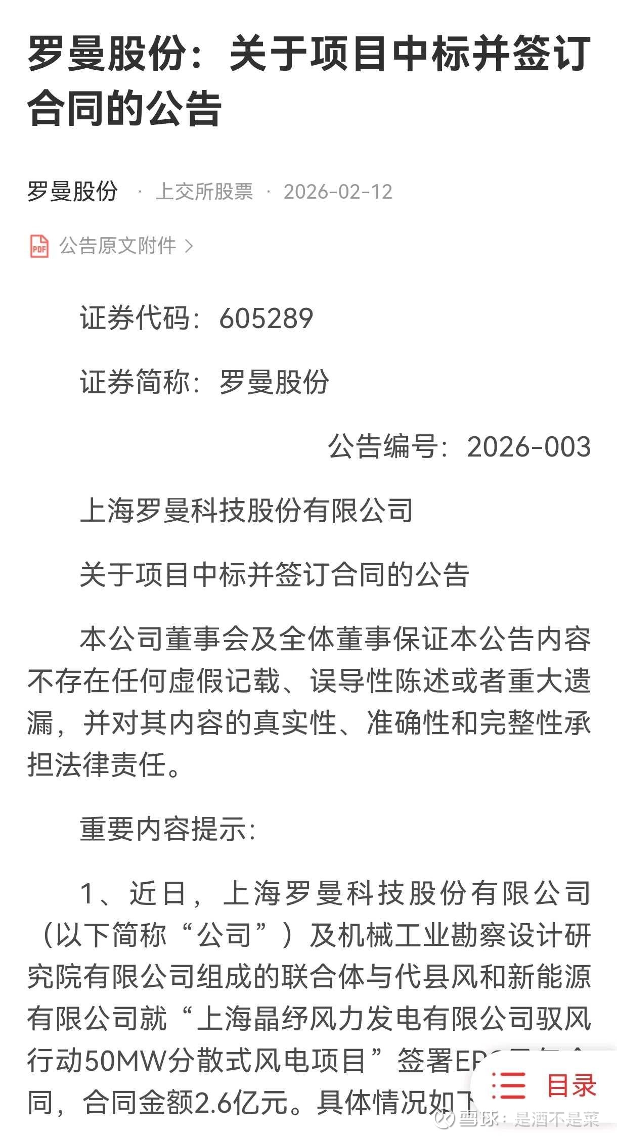 2026年2月12日公告,罗曼股份与机械工业勘察设计研究院有限公司作为联合体成功中标代县风和新能源有限公司“上海晶纾风力发电有限公司驭风行动50MW分散式风电项目”,合同金额2.6亿。