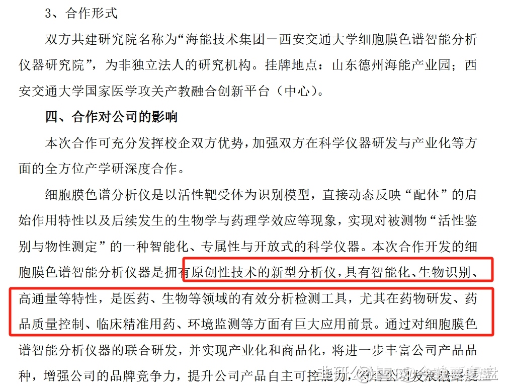 无独有偶,公司近期刚好与西安交大签订了共建研究院合作协议,充分发挥公司在仪器工程化、产业化、市场化方面的优势、西安交通大学创新引领和科技服务支撑作用以及其执行团队在细胞膜色谱技术领域的理论创建、方法创新和对应用价值的深度挖掘所形成的独有的自主知识产权优势,在细胞膜色谱智能分析仪器等方面进行科技开发和成果转化的深度合作。开办资金就14亿。