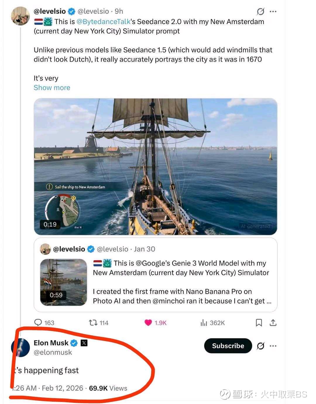 最后、俗话说马年炒老“马”,今天全球首富马斯克也在转发某个网友有关Seedance的评论时,感慨模型发展速度快(It's happening fast)。