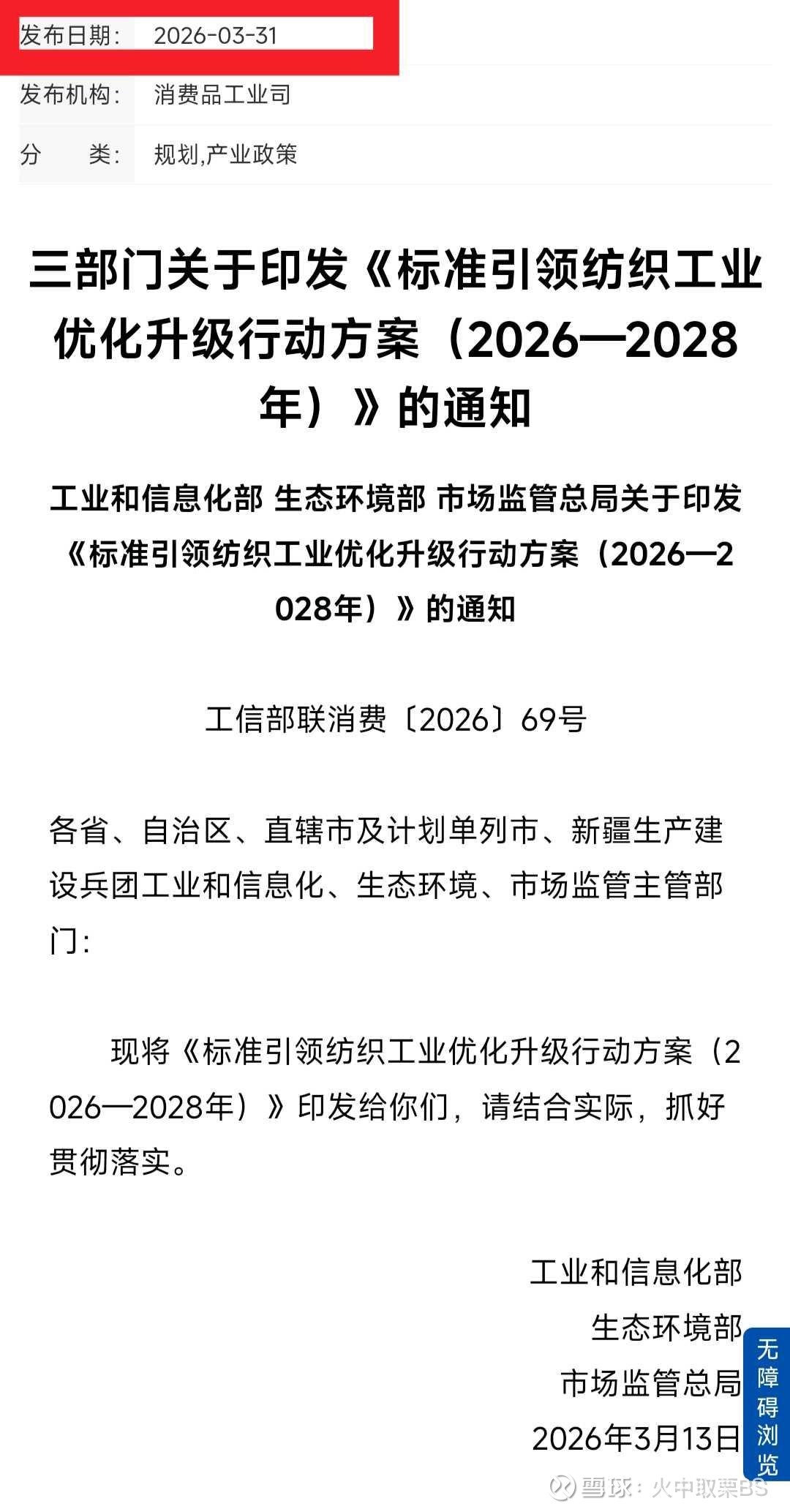 今天,工业和信息化部、生态环境部、市场监管总局联合印发《标准引领纺织工业优化升级行动方案(2026—2028年)》。