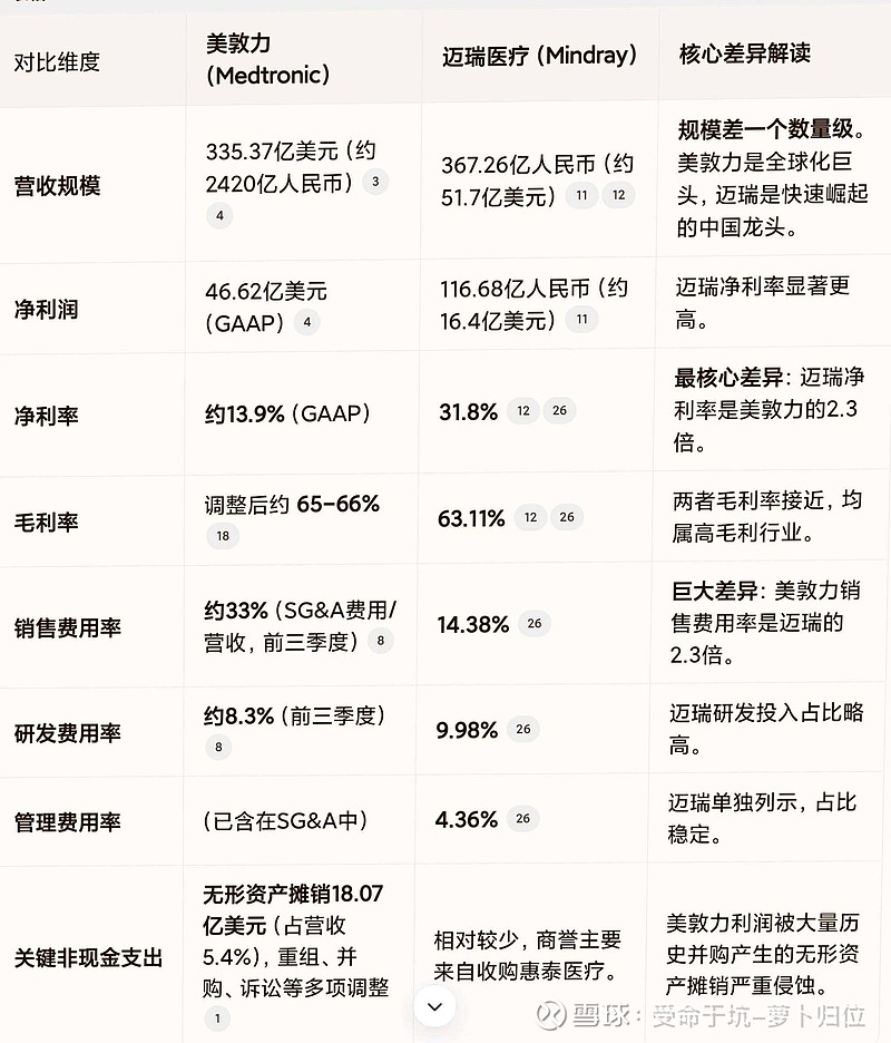 $迈瑞医疗(SZ300760)$迈瑞医疗和美敦力毛利率相近,但是净利率迈瑞是美敦力的2.3倍。是因为我们的产品成本低吗?不是,因为毛利率是相近的。真实答案在这张表销售和管理费用占比,美敦力高太多。欧美的学术界可不是那么好侍候的。所以,我们期待着迈瑞医疗出海赚美元,远离卷王市场,赚取高净利润。怕是镜花水月咯。期待大神们纠错