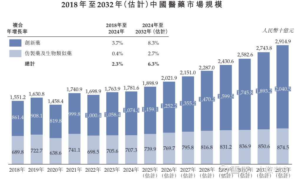 按销售收益计,预计中国医药市场规模将由2024年的人民币17,816亿元增长至2032年的人民币29,149亿元,复合年增长率达6.3%。其中,创新药市场规模预计将由2024年的人民币10,743亿元增长至2032年的人民币20,405亿元,复合年增长率达8.3%,而 仿 制 药 及 生 物 类 似 药 的 市 场 规 模 预 计 将 由2024年 的 人 民 币7,073亿 元增长至2032年的人民币8,745亿元,复合年增长率为2.7%。
