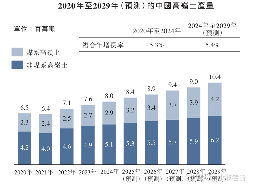 受技术创新、政策支持以及全球贸易扩张的推动,中国高岭土产量正在稳定增长。根据弗若斯特沙利文的数据,2020年至2024年,中国高岭土产量总体呈增长趋势,尤其在2022年和2024年,增速显著增快。预计至2029年,中国高岭土产量将达到1,040万吨,2024年至2029年的复合年增长率为5.4%。由于高岭土在传统领域以及新兴领域高端产业的应用与日俱增,中国高岭土矿石产量将持续增长。