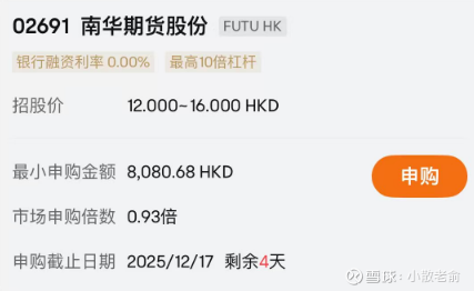 公司12月12日开始招股,招股价12~16港元,每手股数500股,最低认购8080.68港元,市值86.13亿~114.84亿港元,发行数量1.08亿股,属于证券及经纪行业,有绿鞋,无基石。