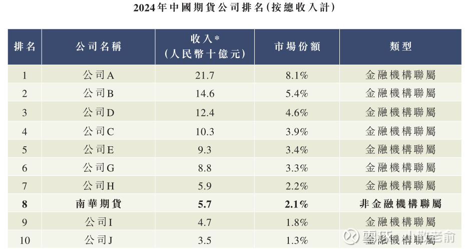 2024年,就总收入而言,南华期货在所有期货公司中排名第8位,在所有非金融机构相关期货公司中排名第1位,总收入为人民币57亿元。2024年,就经纪佣金收入而言,南华期货在所有期货公司中排名第16位,在所有非金融机构相关期货公司中排名第1位,总收入为人民币5亿元。