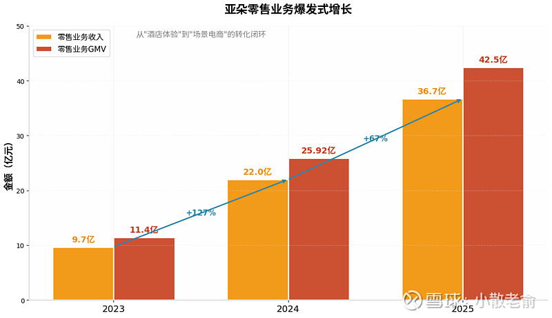 但真正让我眼前一亮的,是收入结构的变化。2025年,零售业务干到了36.7个亿,同比增长67%,占集团总收入的比重已经飙升到接近42%。朋友们,这可不是小打小闹了。四成营收来自卖枕头、卖被子、卖睡衣,这意味着什么?意味着亚朵的成长逻辑已经变了。
