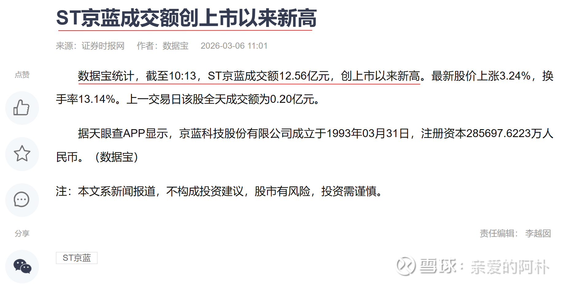 2026年3月6日(周五),证券时报网报道,据数据宝统计,截至10:13,ST京蓝成交额12.56亿元,创上市以来新高。