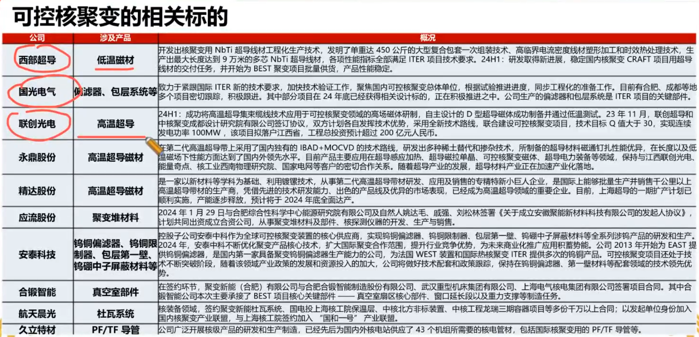 注:文档中还提到其他公司如聚变新能、瀚海金环、能量奇点等,但这些是非上市公司或未明确上市代码,因此未列入列表。投资时建议关注链主公司(联创光电、国光电器、西部超导)和事件催化。