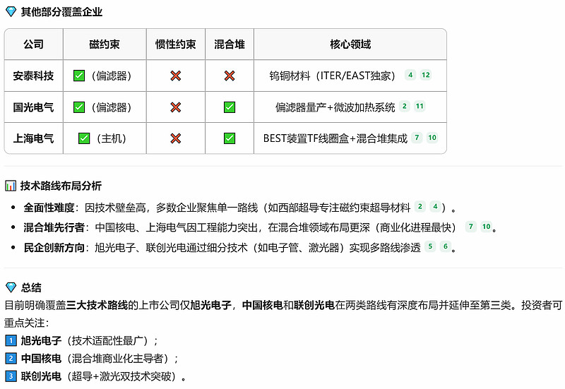 根据公开信息整理,目前中国A股市场中同时布局磁约束、惯性约束、聚变-裂变混合堆三大技术路线的上市公司较少,以下为综合技术覆盖完整性与产业链参与深度的代表性企业: