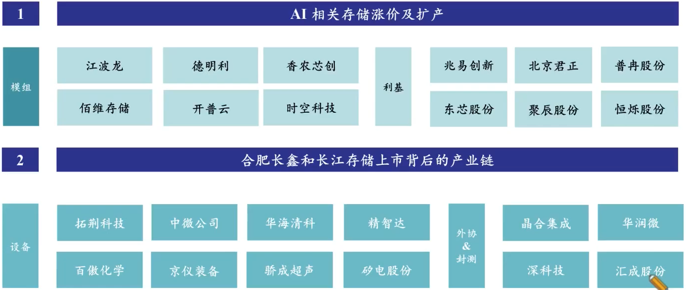 1. 长川科技:已打入长存、长鑫供应链;在长存的项目进展顺利;预计在某个时间点前,所有品类测试机会搬入长存做 Demo 验证;预计年底左右,能给出“长存系 + 华为系”明年的订单指引。