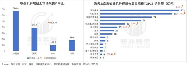 “药不能停”式的庞大需求,让一个千亿市场拔地而起。如下图,截至2025年6月,中国线上敏感肌护理市场规模整体达到664.4亿元。