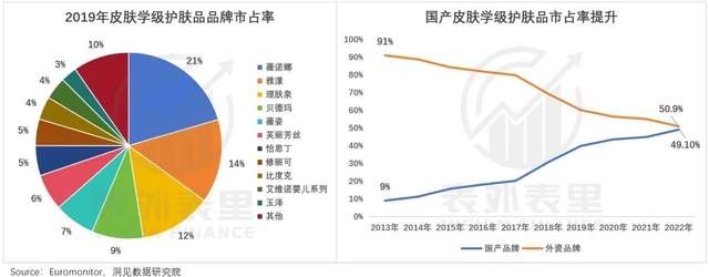 这样一来,消费者会如何选择不言而喻。如下图,2019年国产品牌薇诺娜、玉泽的市占率,荣登第一、第二;2022年国产皮肤学级品牌的市占率增长至49.1%,几乎和外资品牌持平。