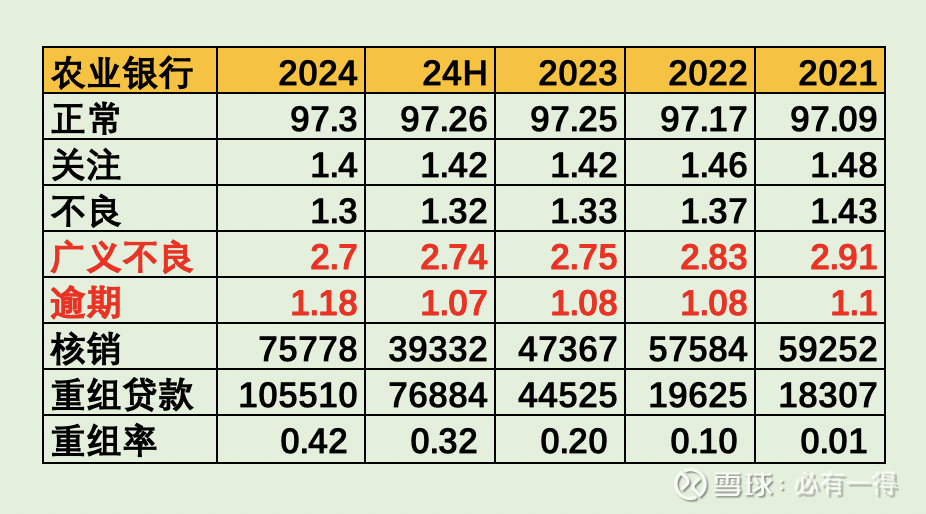 目前农业银行的贷款质量处于稳中有降,但降幅缩小。同时通过大量核销、重组等技术手段,让数据保持平稳。
