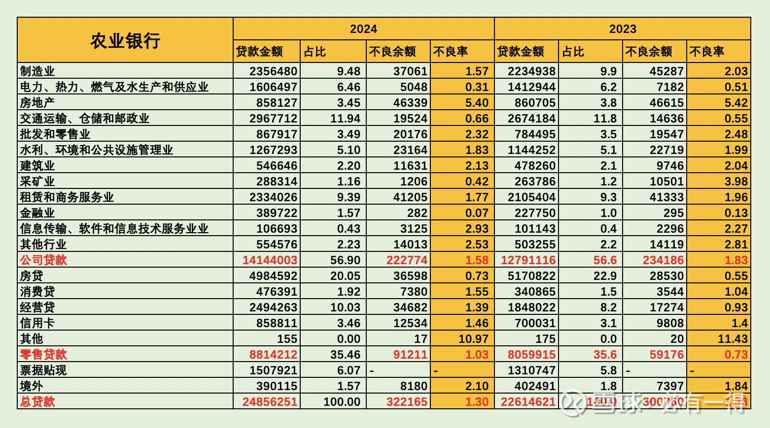 2024年,农业银行的贷款大量投放给「经营贷」「消费贷」「信用卡」。