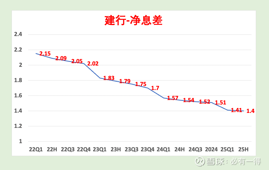 净息差较Q1微跌1个基点。目前,建行的生息资产收益率2.82,贷款利率2.96。负债端,得益于今年存款利率下降,上半年的存款付息率仅1.40%。因为良好的管控负债端,建行的净息差下降微乎其微