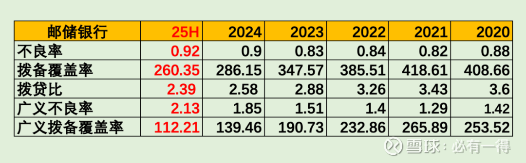 拨备覆盖率下降25.8个百分点,绝对值260.35。拨贷比下降19个bps,绝对值2.39。这两个数据表面上似乎还行,可深入研究,黯然失色。用老必更喜欢的指标,广义拨备覆盖率来看,目前邮储只有112%,早已没有曾经高达250%的风采,相当于腰斩