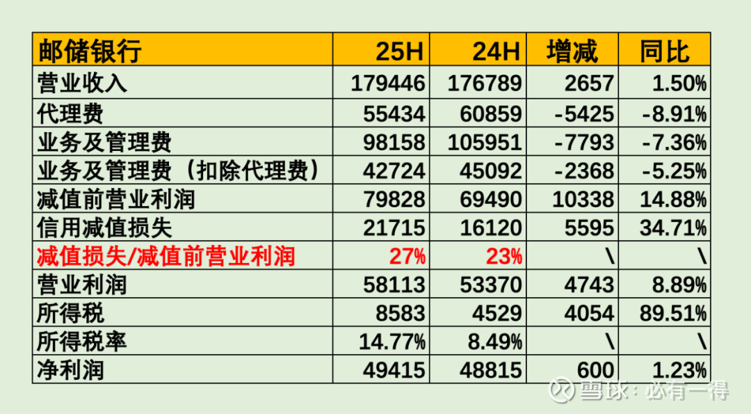 上半年,邮储银行营收多增27亿,同比增长1.5%。代理费支出减少54亿,纯管理费支出减少24亿,使减值前营业利润增加103亿。再多计提56亿减值损失,让营业利润增加47亿,同比增长9%。