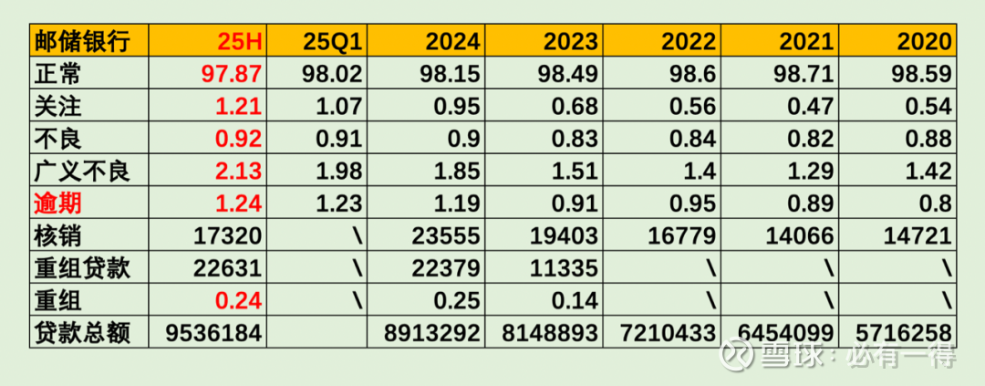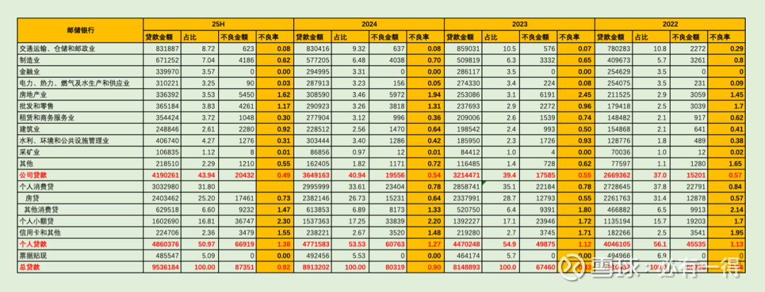 过往分析,老必最担心的是个人小额贷,即经营贷。它是邮储银行规模增速最快、不良率最高、不良金额最大的贷款品种。今年上半年,邮储投放降速,占比下滑0.44个百分点,应该是有意控制风险。管理层做的很正确