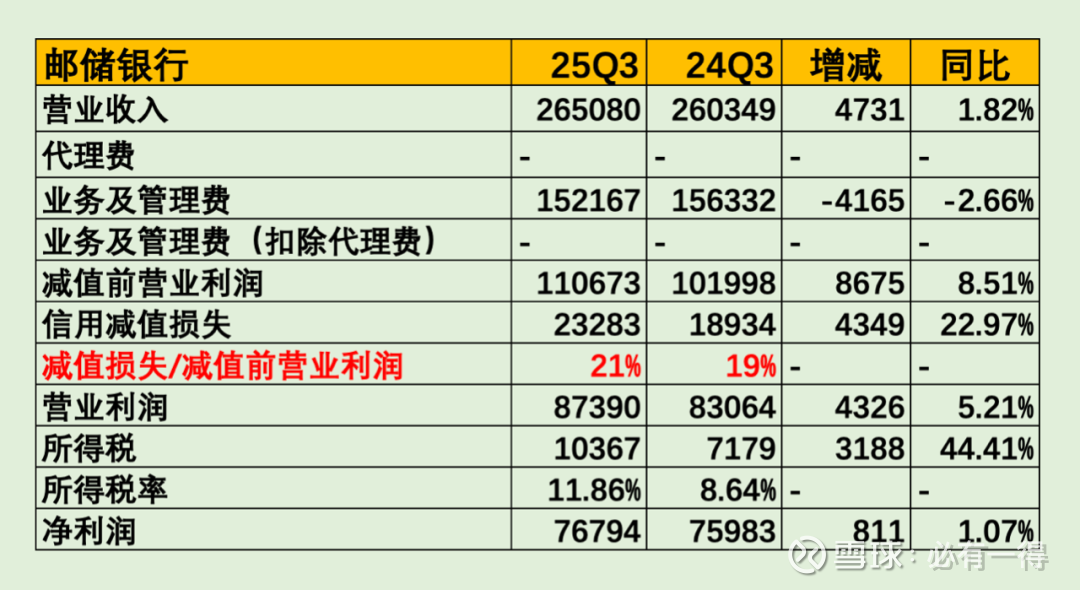 营业收入增加47亿,业务管理费(含代理费)减少42亿,减值前营业利润增加87亿。再多计提43亿减值损失,计提比例由19%上升21%,让营业利润增加43亿,同比增加5%。