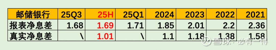 如此低的净息差,是邮储无法补充拨备的原因。比如农行的净息差较低,但也有1.3。这意味着每配置100亿的生息资产,农行比邮储收入多3千万,在其他条件相同的情况下,农行可将这3千万全部补充拨备![]()