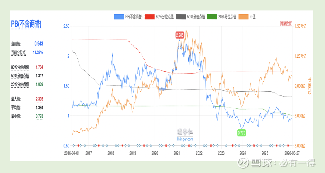 PB值处于近十年百分位10%的位置,属于低估区间![]()