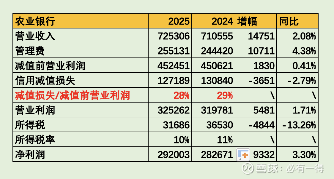 营收增加148亿,管理费多支出107亿,减值前营业利润增加18亿,增幅0.41%。信用减值损失少计提37亿,计提比例由29%下降至28%,让营业利润增加55亿,同比增长1.7%。