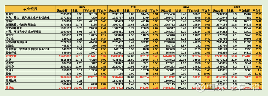 重点分析「经营贷」:贷款规模占比11%,排名第3。同时增速较高,预计26年上升至第2,仅次于房贷。但不良余额排名第1,且不良率恶化很快,上升46个基点,增幅第1。老必略有担心![]()