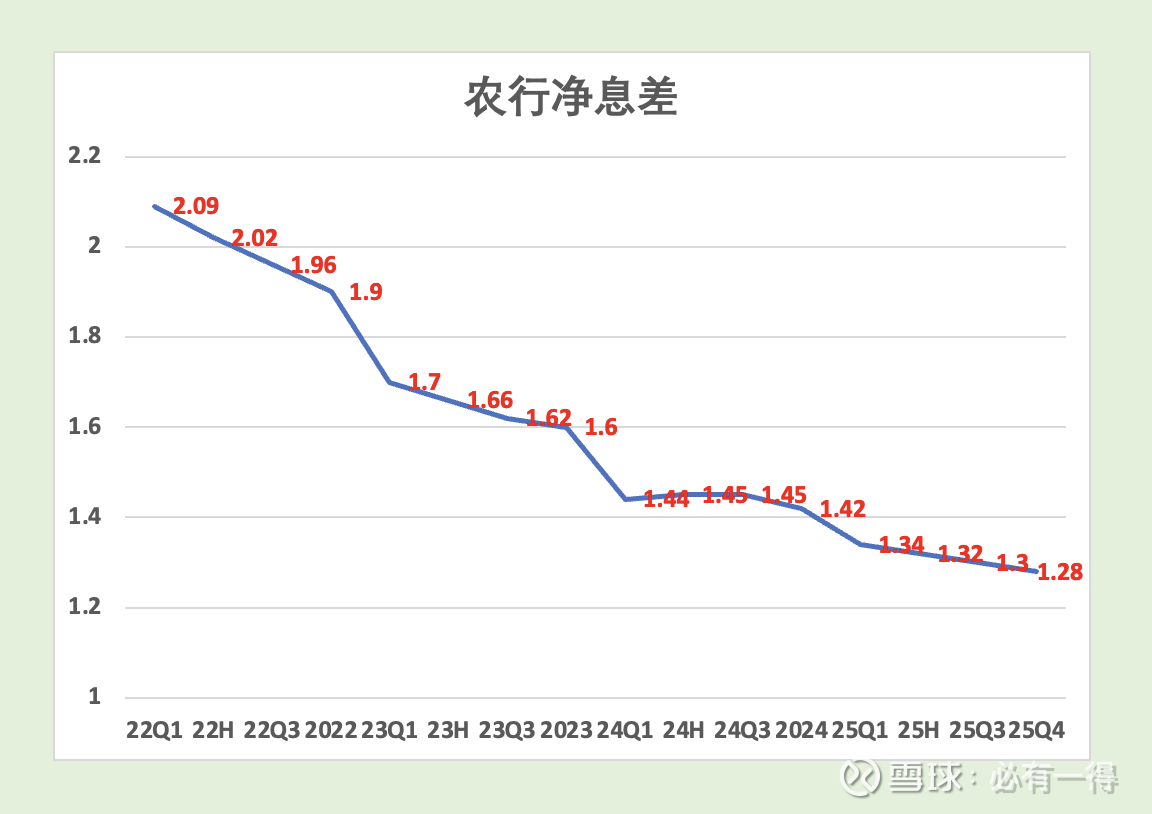 目前,农行的生息资产收益率2.69%,贷款利率2.88%,分别下降43、53个基点。有息负债付息率1.53%,存款利率1.34%,分别下降32、29个基点。