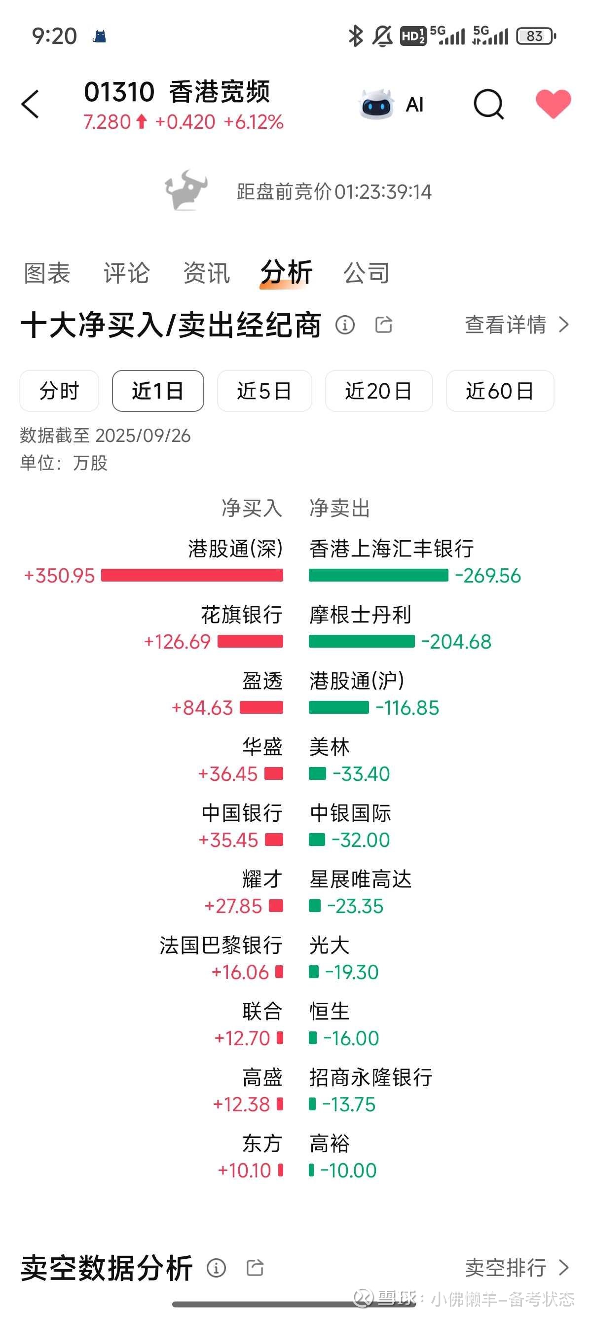回复@小佛懒羊-躺平装死: 羊,香港宽频回到8块了,可惜我早走了//@小佛懒羊-躺平装死:回复@小佛懒羊-躺平装死:$香港宽频(01310)$24日的交割数据,基本锁定大摩和汇丰席位是配售席位了,那25号盘尾砸盘来配售完毕的猜想应该是对的,周一或者周二应该会有配售完成的公告了 查看图片