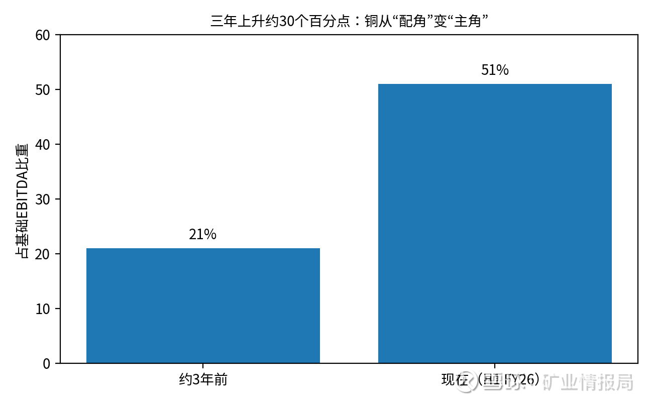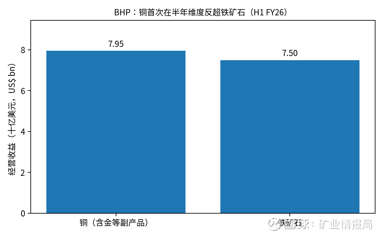 在截至2025年12月的六个月里,铜(含金等副产品)为BHP贡献经营收益79.5亿美元,超过铁矿石的75.0亿美元,并让铜占集团基础EBITDA达到51%。这在BHP历史上是一个里程碑。