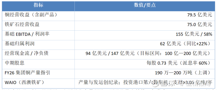 · 铜(含金等副产品)贡献经营收益79.5亿美元,略高于铁矿石的75.0亿美元;铜占基础EBITDA达到51%。