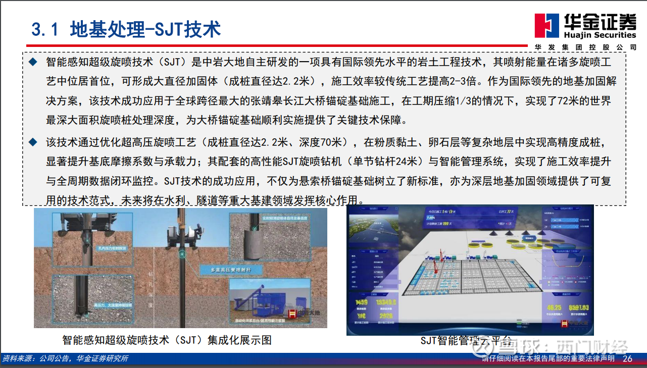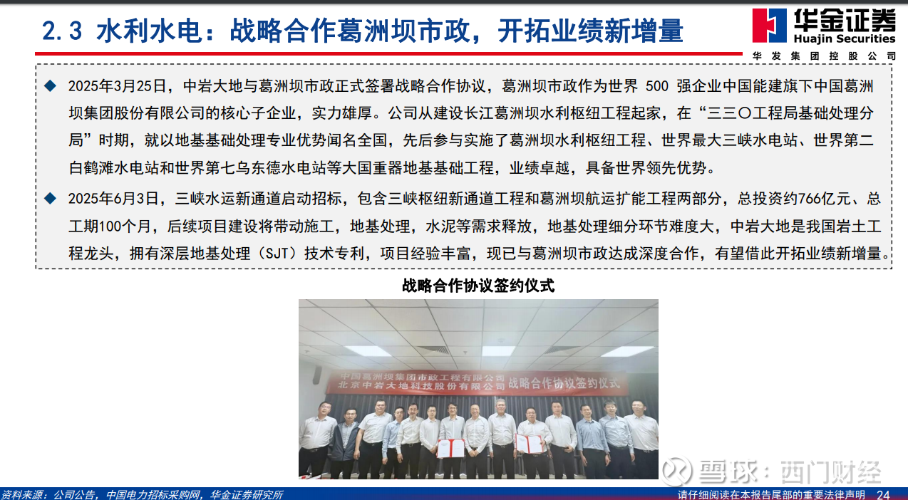 政策加码港口建设提速,软土施工痛点带动高端岩土工程需求,公司软土固化剂推进港口建设效果显著,核心技术已在舟山港等国家重大工程成功应用,有望持续贡献业绩增量。3)水利水电:我国水电开发向高海拔、高寒地区转移,复杂地质条件对岩土工程技术要求高,7月19日,雅鲁藏布江下游水电工程正式开工。公司凭借领先的SJT技术(助力张靖皋大桥创多项世界之最)展现强劲竞争力,已与中国能建葛洲坝达成战略合作,发展前景广阔。